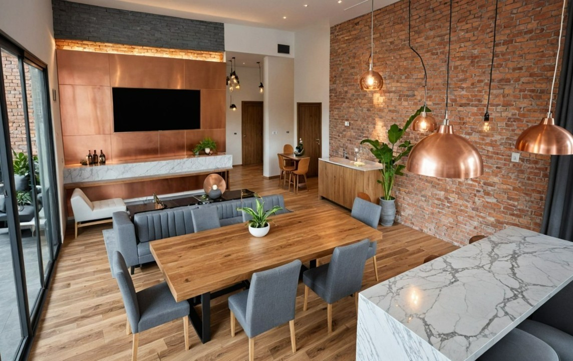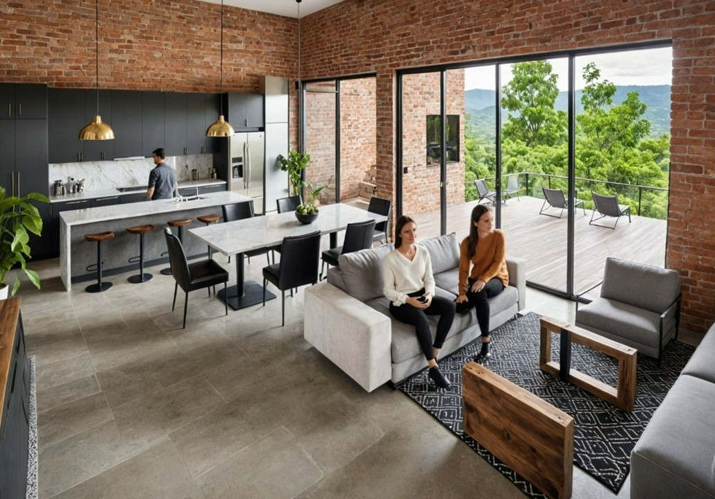 Al ingresar, un amplio espacio de planta abierta combina sala, comedor y cocina en un único ambiente fluido y luminoso. Un gran ventanal conecta directamente con el exterior, donde una piscina infinita y una amplia zona de BBQ se convierten en protagonistas de la vida social y de descanso al aire libre.
